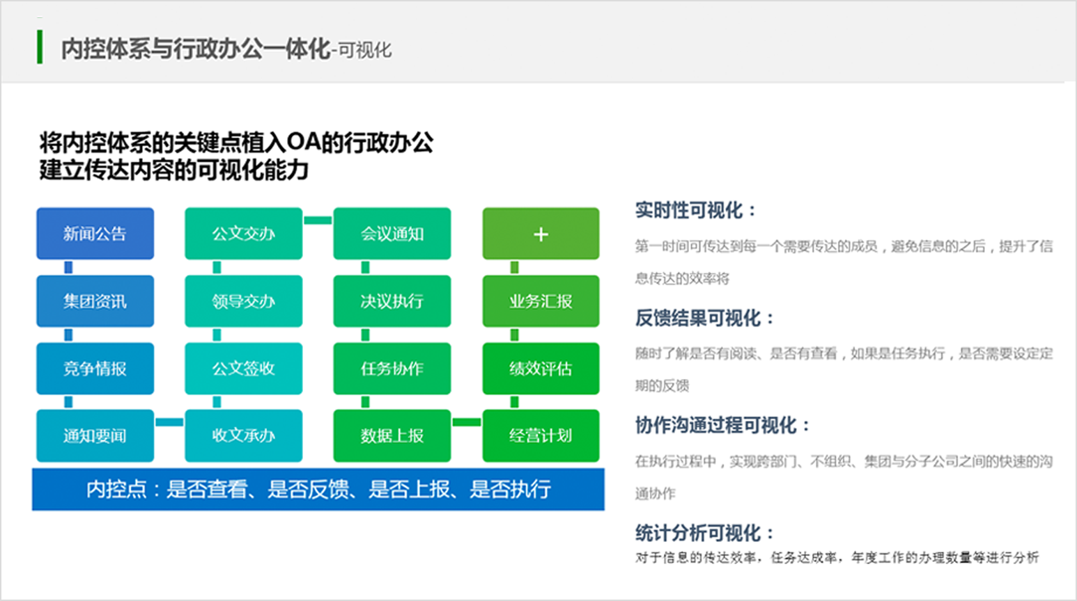 江蘇國信集團攜手泛微共建高效的協(xié)同辦公平臺。江蘇國信集團希望通過OA來建設(shè)內(nèi)控系統(tǒng),避免重復(fù)建設(shè)與信息孤島;將內(nèi)控體系與實際工作相結(jié)合,避免工作與內(nèi)控相隔離;通過建立可持續(xù)的內(nèi)控體系宣傳、告知、落實、反饋,避免改善的PDCA化;同時要求技術(shù)達(dá)成一體化,能夠與其他系統(tǒng)對接。因此,用OA平臺來承建內(nèi)控體系,基于泛微OA平臺的七大引擎構(gòu)建:門戶引擎、流程引擎、建模引擎、內(nèi)容引擎、集成引擎、移動引擎和組織權(quán)限引擎。一方面避免重復(fù)建設(shè)和信息孤島,另一方面可以讓內(nèi)控與平常在OA的工作事項相互結(jié)合,實現(xiàn)內(nèi)控與工作一體化。
